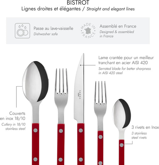 Sabre flatware, specifically the Bistrot and Basic collections, utilizes 18/10 stainless steel for its cutlery, known for its durability, rust resistance, and brilliant luster.