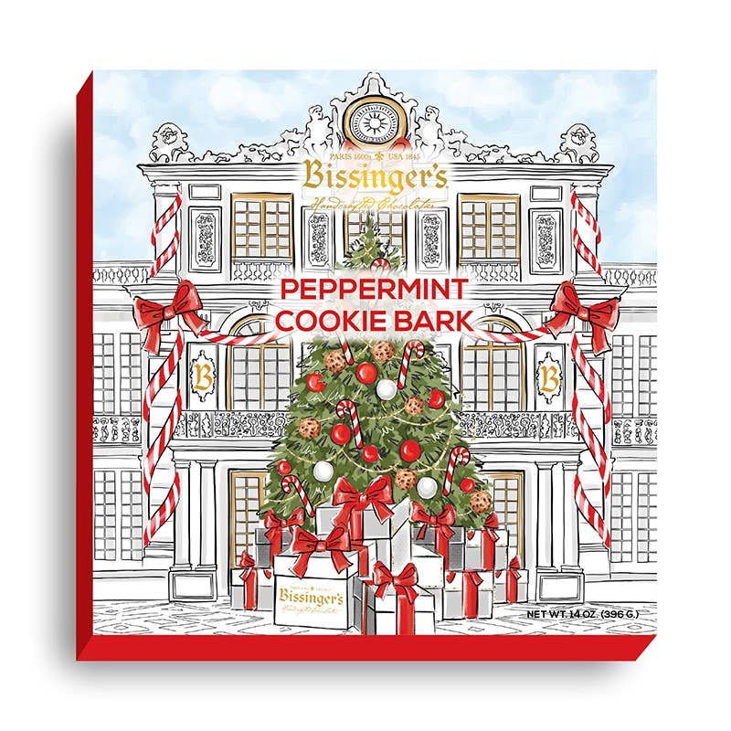 A crunchy and delicious upgrade to this classic holiday treat - Bissinger's 60% Dark Chocolate & White Chocolate are swirled together, infused with natural peppermint oil and topped with natural candy cane pieces and sandwich cookies. Net Weight: 14 OZ