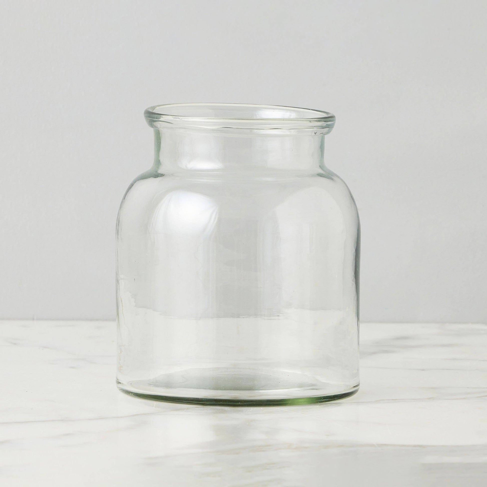 In villages throughout Europe, these wide mouth glass jars were used for the summer harvest. Stunning on their own or en masse, the free form of the vessel ensures it is a striking decorative accent. Perfect for use as a flower vase, organizing small objects throughout the home, or for merchandising in a store. Care and Maintenance * Hand wash or spot clean with a soft, damp cloth.